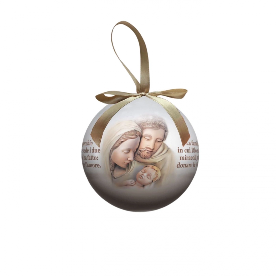 Pallina natalizia (del diametro di 7,5 cm) inserita all'interno di una bella confezione in cartoncino (dalle misure 10,5x8 cm) che la rende adatta per essere regalata. Sulla pallina è presente la rappresentazione della Santa Famiglia e la frase: "La Famiglia è lo specchio in cui Dio si guarda e vede i due miracoli più belli che ha fatto: donare la vita e donare l’amore". Bellissimo articolo da acquistare per sé stessi, per arricchire il proprio albero di natale con oggetti sacri o da regalare a qualcuno di speciale per augurargli un sereno Natale da trascorrere insieme alla cosa più preziosa: la famiglia.