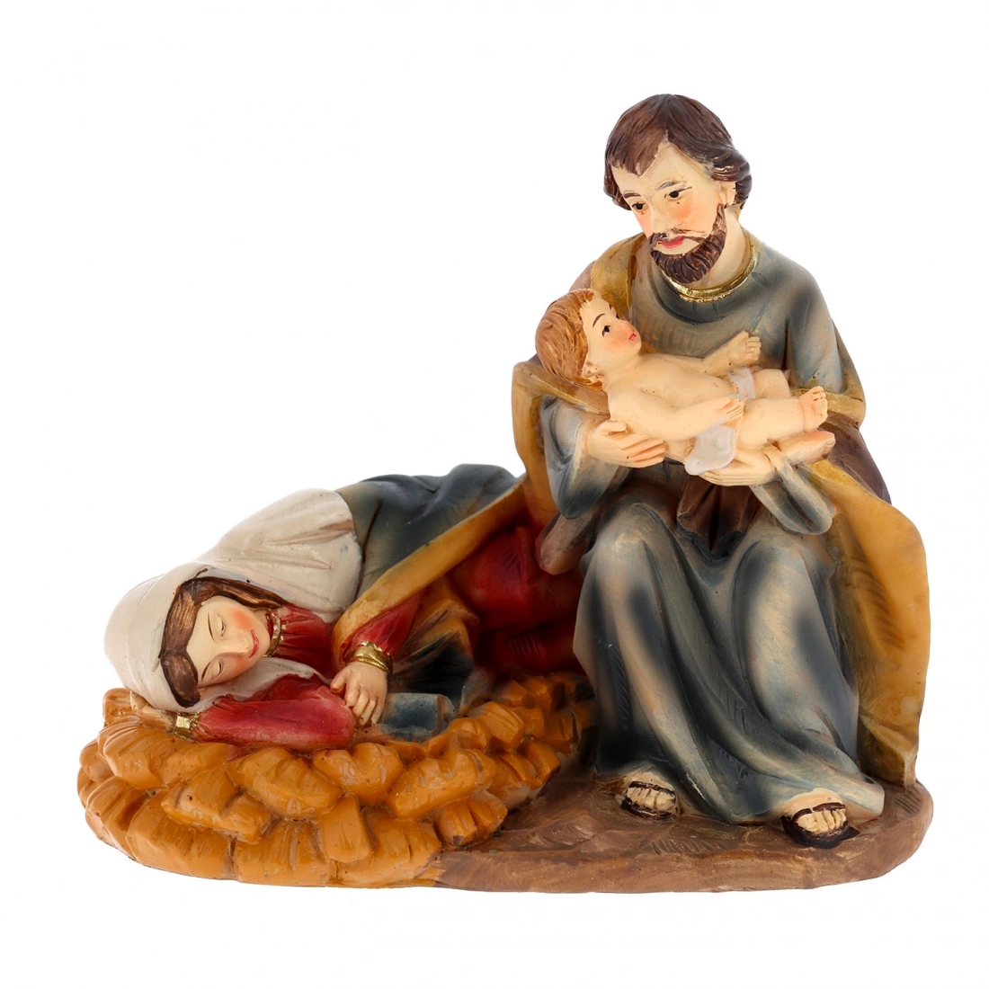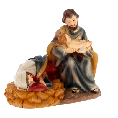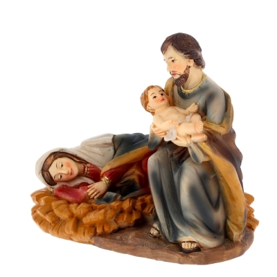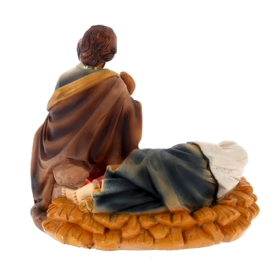 Bellissima ed originale raffigurazione, in resina, dalle dimensioni di h. 10 x 11 x 7,5 cm, della Natività con la Madonna sdraiata in atteggiamento di riposo e San Giuseppe che tiene in braccio Gesù Bambino appena nato. Ideale come dono per le festività natalizie, ma anche da acquistare per arricchire e dare un tocco di originalità al proprio presepe. La statua è fornita in scatola con apposito imballo.