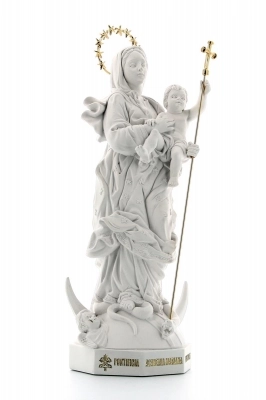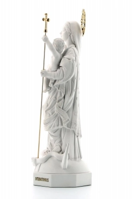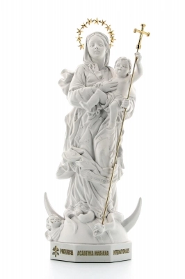 Bellissima statua, raffigurante la Madonna con Gesù Bambino in braccio, impreziosita da elementi in ottone dorato, come la tipica aureola con le stelle e la croce astile che tiene in mano Gesù Bambino. Realizzata in polvere di marmo e dipinta interamente a mano. Eseguita interamente a mano, dallo stampaggio alle finiture, presenta dettagli curati in ogni minimo particolare. Realizzata appositamente per Editrice Shalom, che ne ha seguito direttamente tutta la lavorazione, dalla scultura in plastilina, alla realizzazione del primo modello fino alla fase di pittura.