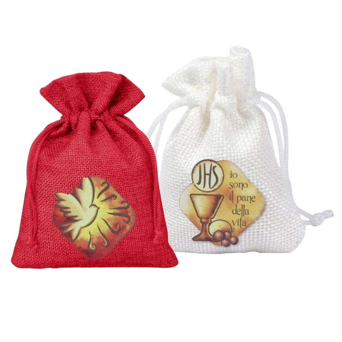 Carinissimo sacchetto in juta su cui è stata applicata una rappresentazione simbolica stampata su legno. Il sacchetto è disponibile nelle varianti Comunione, Cresima, Battesimo e Matrimonio, per rendelo adatto a qualsiasi occasione. E' un oggetto molto versatile, infatti può essere utilizzato come porta confetti per bomboniere, oppure potrebbe diventare un'originale confezione regalo da donare a chi si appresta a questi Sacramenti, oppure potrebbe essere un utilissimo e pratico porta Corona del Rosario, per portarla sempre con sè. I sacchetti sono tutti di colore bianco, a parte quello per la Cresima che è rosso.