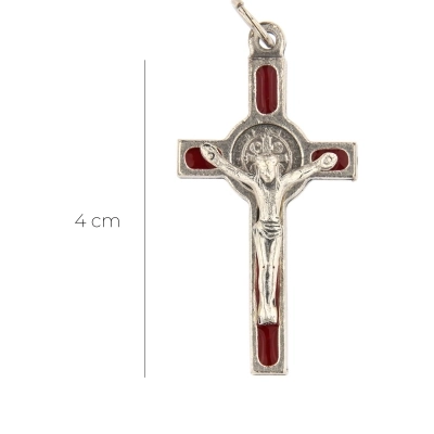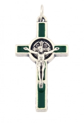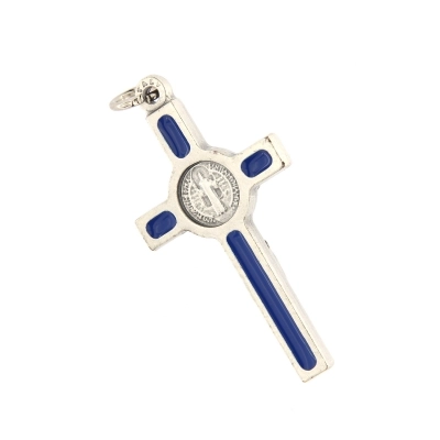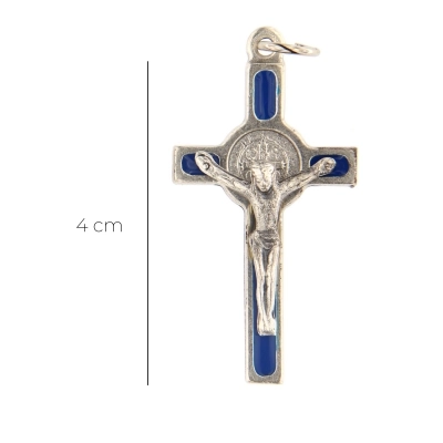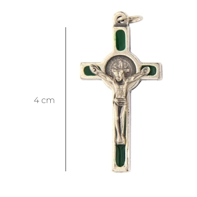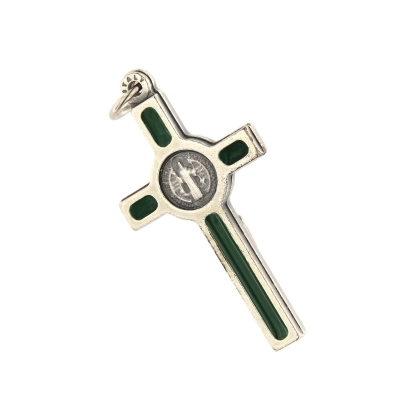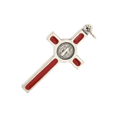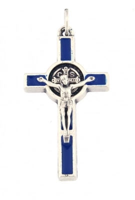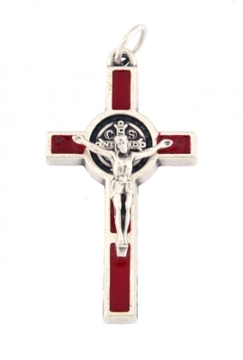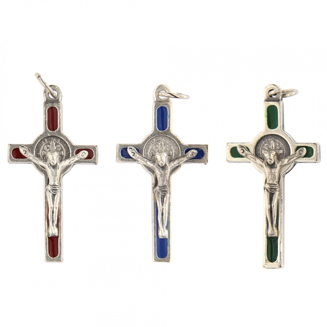 Croce di San Benedetto in metallo smaltato colorato, dotata di anello per essere abbinata ad una catenina e indossata al collo. Dimensioni 2,5x4 cm. Disponibile nei colori rosso, verde e blu.