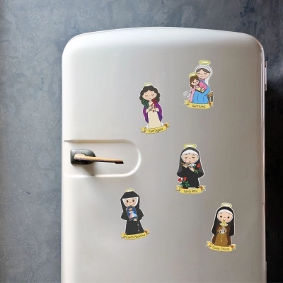 Una linea di calamite colorate e sagomate pensate per i bambini! Sant’Agata, Sant’Agnese, santa Chiara… e tante altre sante! Ben 25 soggetti diversi, ideali per avvicinare i più piccoli alle sante! Originale idea regalo; è un simpatico souvenir per le basiliche o i santuari dedicati a uno di questi santi.