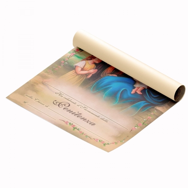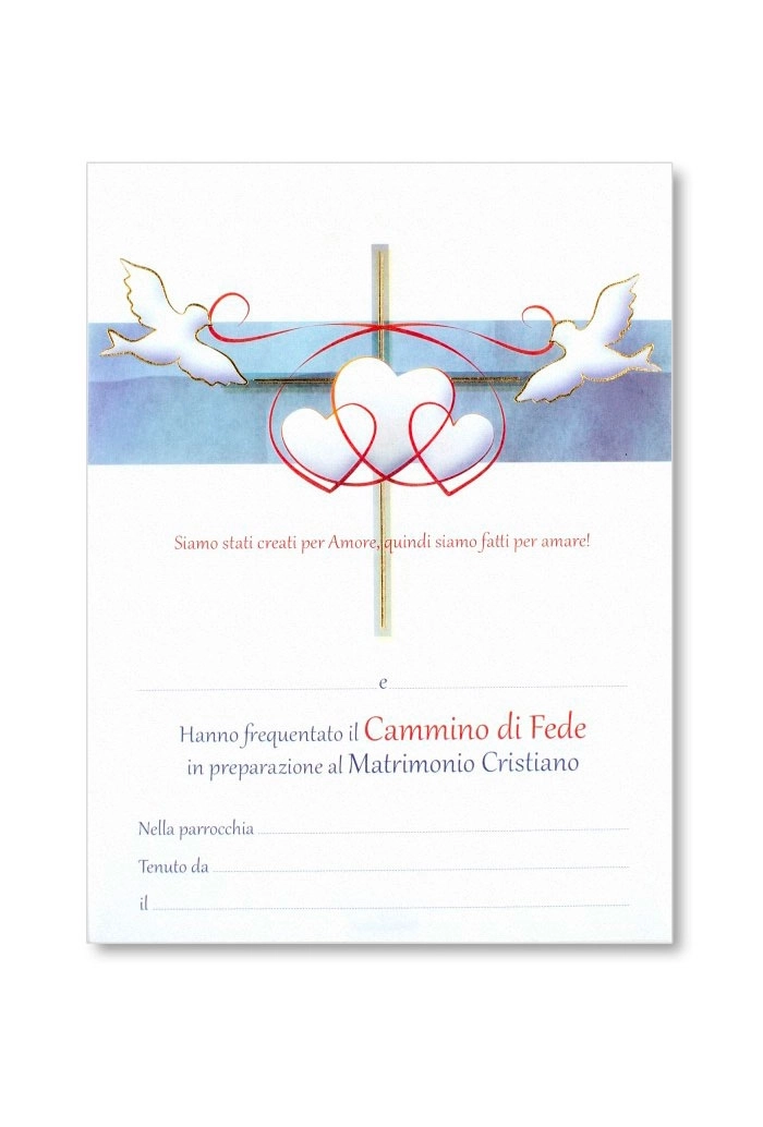 Diploma in ricordo della preparazione al matrimonio cristiano, compilabile e stampato su vera carta pergamena e arricchito da dettagli in oro a caldo.