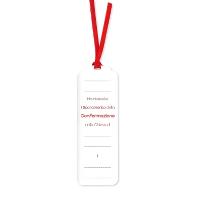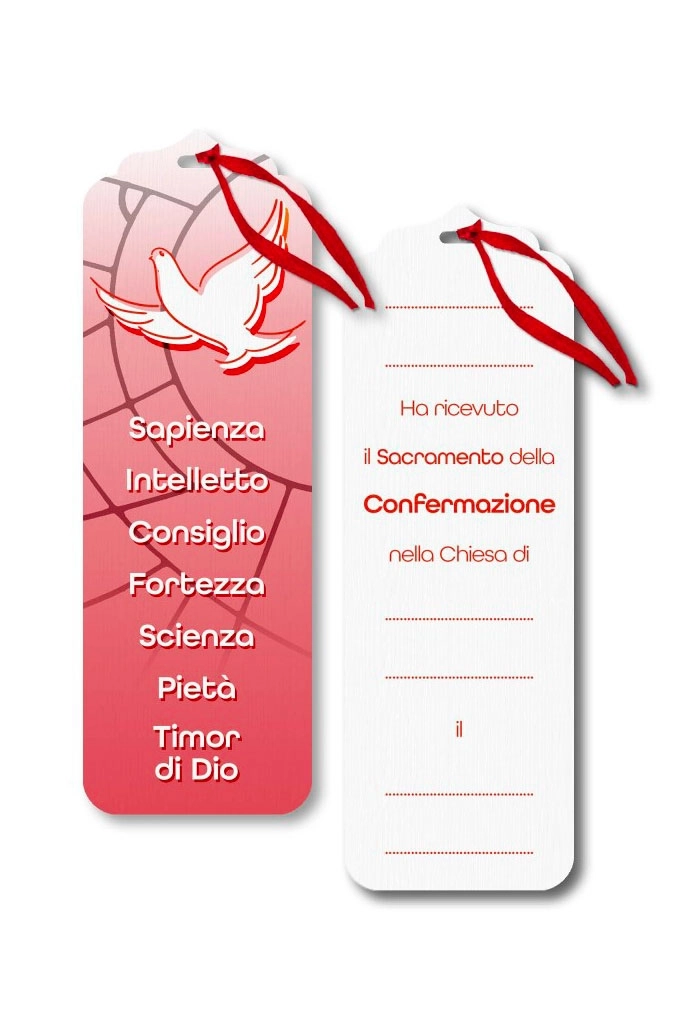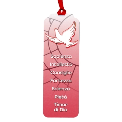 Simpatico ed allo stesso tempo elegante segnalibro della Cresima, con la Colomba e i doni dello Spirito Santo stampati direttamente su legno, può essere utilizzato anche come chiudipacco grazie al cordino in raso rosso.