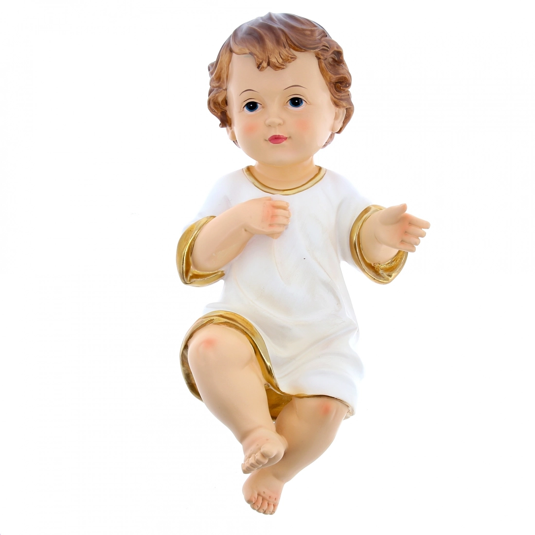 Dolcissima statua, dall'altezza di 29 cm, che rappresenta Gesù Bambino con indosso una raffinata veste, realizzata in resina e dipinta a mano. Ideale da esporre in qualsiasi ambiente domestico o da donare a Natale: un piccolo pensiero di grandissimo valore! Consigliata anche per completare il presepe nei luoghi di culto.