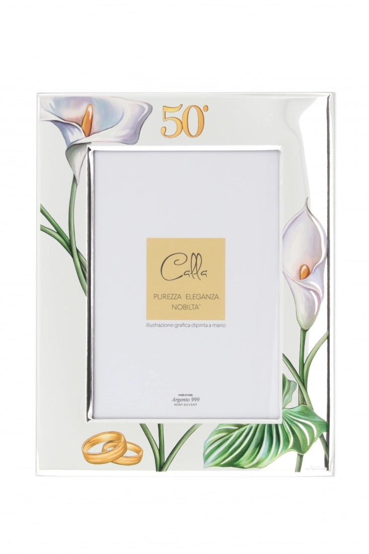 Cornice portafoto in argento con retro in legno bianco. Realizzata in miro silver, nuovo metallo che include uno strato di argento puro 999,95%, conferendo al metallo una grande solidità e resistenza all'ossidazione. Il bordo è decorato con un disegno smaltato che riproduce delle calle, mentre in basso ci sono due fedi dorate intrecciate. Al centro è posto il numero 50° dorato, per cui si rende l' articolo ideale da regalare per celebrare un cinquantesimo anniversario di matrimonio. Il portafoto può ospitare una foto con formato 13x18 cm. I colori sono vivaci e i disegni molto ben definiti. Realizzato in Italia da un'azienda leader nella produzione di quadri e oggettistica da regalo in argento.