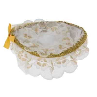 Culla, delle dimensioni di 15x18 cm, adatta per accogliere la statua di Gesù bambino. La struttura in vimini è interamente ricoperta da un tessuto chiaro, decorato e impreziosito da un elegante merletto che corre intorno a tutto il perimetro, lavorato a macchina; vi sono raffigurati dei fiori i cui petali sono arricchiti da un ricamo dorato. Prodotto di ottima fattura e curato in ogni particolare.