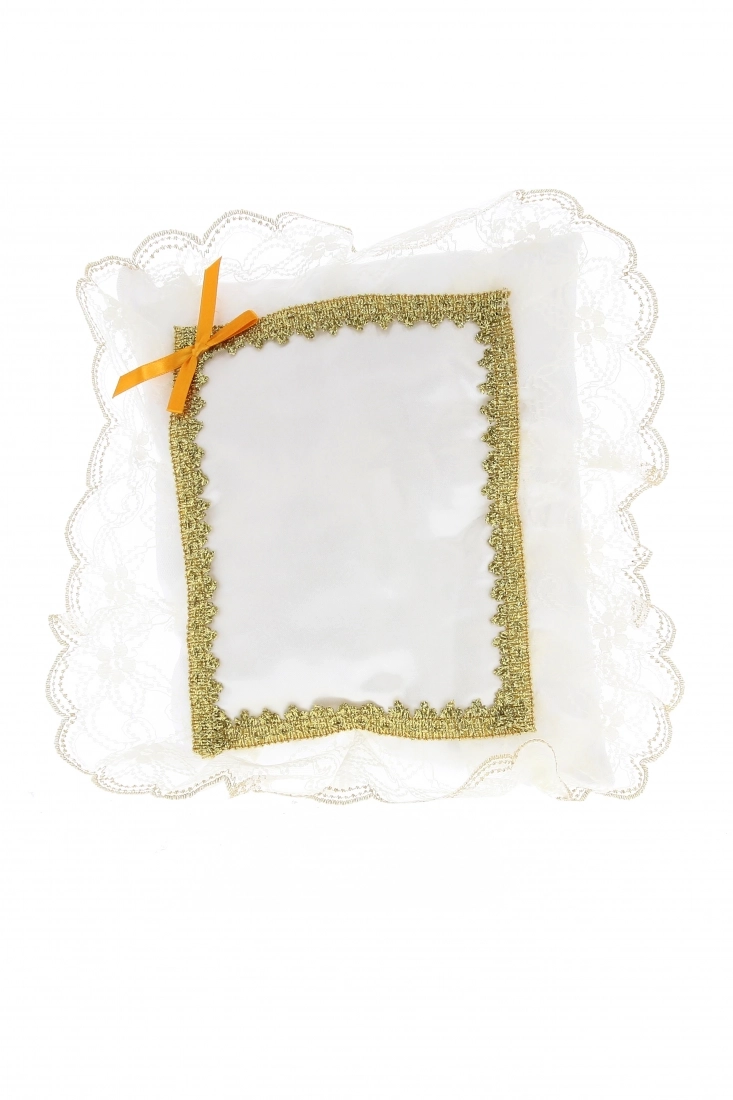 Soffice cuscino in stoffa, della dimensione di 25x35 cm, adatto per accogliere la statua di Gesù bambino. Realizzato interamente in tessuto chiaro, con particolari dorati e fiocchetto arancione, e impreziosito da un elegante merletto lavorato a macchina che corre intorno a tutto il perimetro. Prodotto di ottima fattura e curato in ogni particolare.