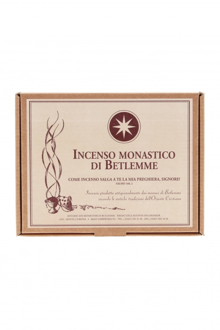 Incenso di ottima qualità prodotto artigianalmente e in spirito di preghiera e silenzio dai Monaci di Betlemme, secondo gli antichi metodi tradizionali dell’Oriente cristiano. Confezionato in una bustina trasparente (del peso di 225 grammi), è posto all’interno di un elegante cofanetto in cartoncino, per preservarne la profumazione. Le profumazioni disponibili sono: rosa – ambra – caprifoglio – nardo – mirra – gelsomino – sandalo – magnolia. Tutte le profumazioni sono delicate, gradevoli ed incredibilmente persistenti, segno questo che il prodotto è di ottima qualità e realizzato con materiali di primissima scelta.