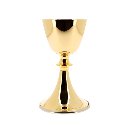 Elegante calice eucaristico, dell'altezza di 20,5 cm e del diametro di 10 cm, interamente realizzato in ottone dorato liscio, con nodo centrale che rende comoda l'impugnatura. Il prodotto è realizzato in Italia con materiale di primissima qualità.