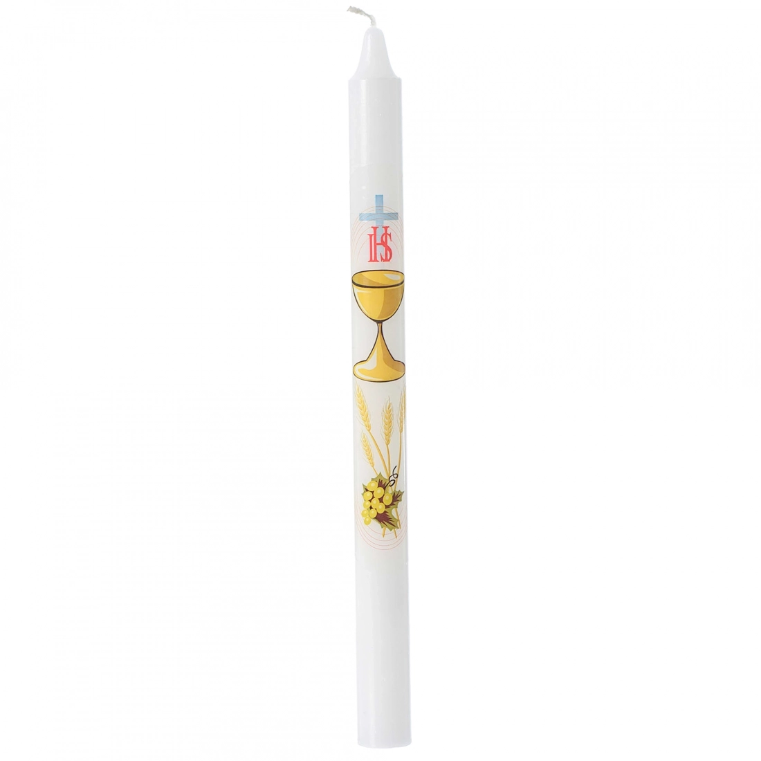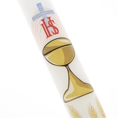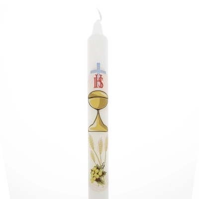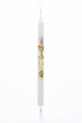 Candela in cera bianca (2 cm di diametro e 27 cm di altezza), decorata con simboli eucaristici e confezionata in busta trasparente. Ideale per la Prima Comunione.