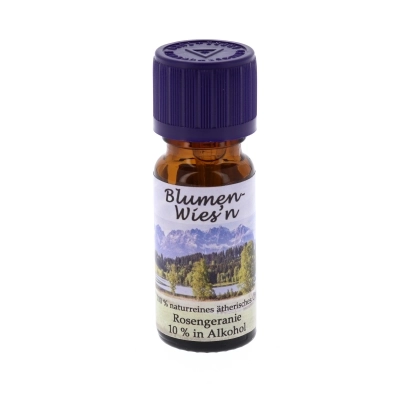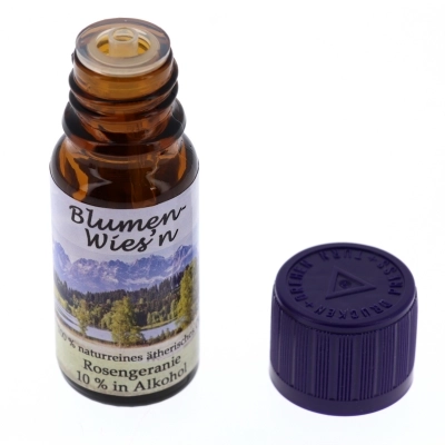 Flacone in vetro di olio essenziale di Geranio rosa, perfetto per gli ambienti o per la cura del corpo. Flacone da 10 ml. Contenuto di alcol 10%.