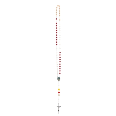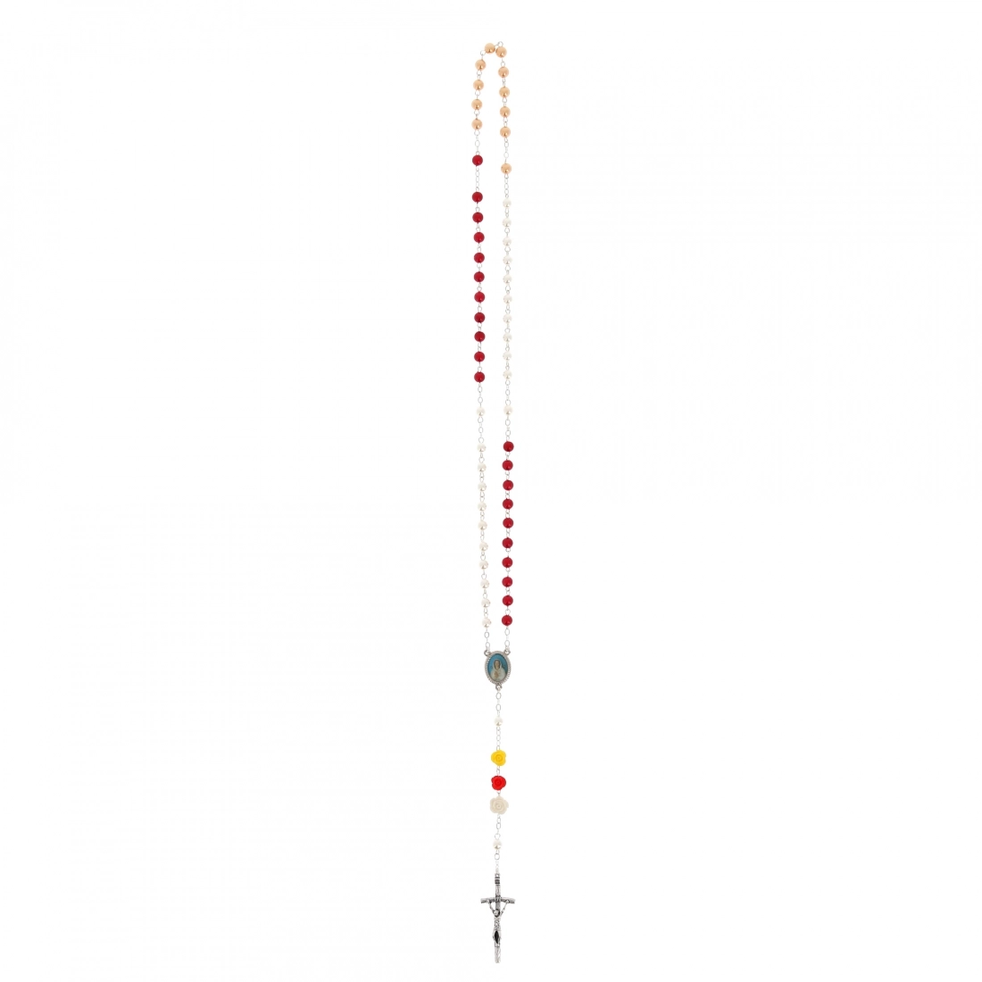 La corona è composta da 5 poste di 10 grani, di diametro 6 mm, perlati colorati. La crociera raffigura Maria Rosa Mistica e la croce è una semplicissima croce pastorale. Corona dedicata a Maria Rosa Mistica, nome con cui la Madonna si è presentata alla veggente Pierina Gilli. Nell'apparizione del 13 luglio 1947 la Vergine aveva tre rose sul suo mantello: una bianca, una rossa e una gialla; esse rappresentano rispettivamente la preghiera, il sacrificio e la penitenza che i fedeli devono praticare in riparazione dei peccati. In questa apparizione, inoltre, la Madonna disse a Pierina: "Desidero che il 13 di ogni mese venga riguardato come giornata dedicata a speciali preghiere da iniziare dodici giorni prima. Io farò scendere in tale giorno abbondanza di grazie e santità di vocazioni sopra coloro che mi avranno onorata". La festa in onore di Maria Rosa Mistica si celebra ogni anno proprio il 13 luglio.