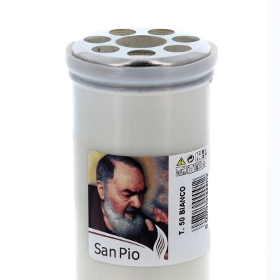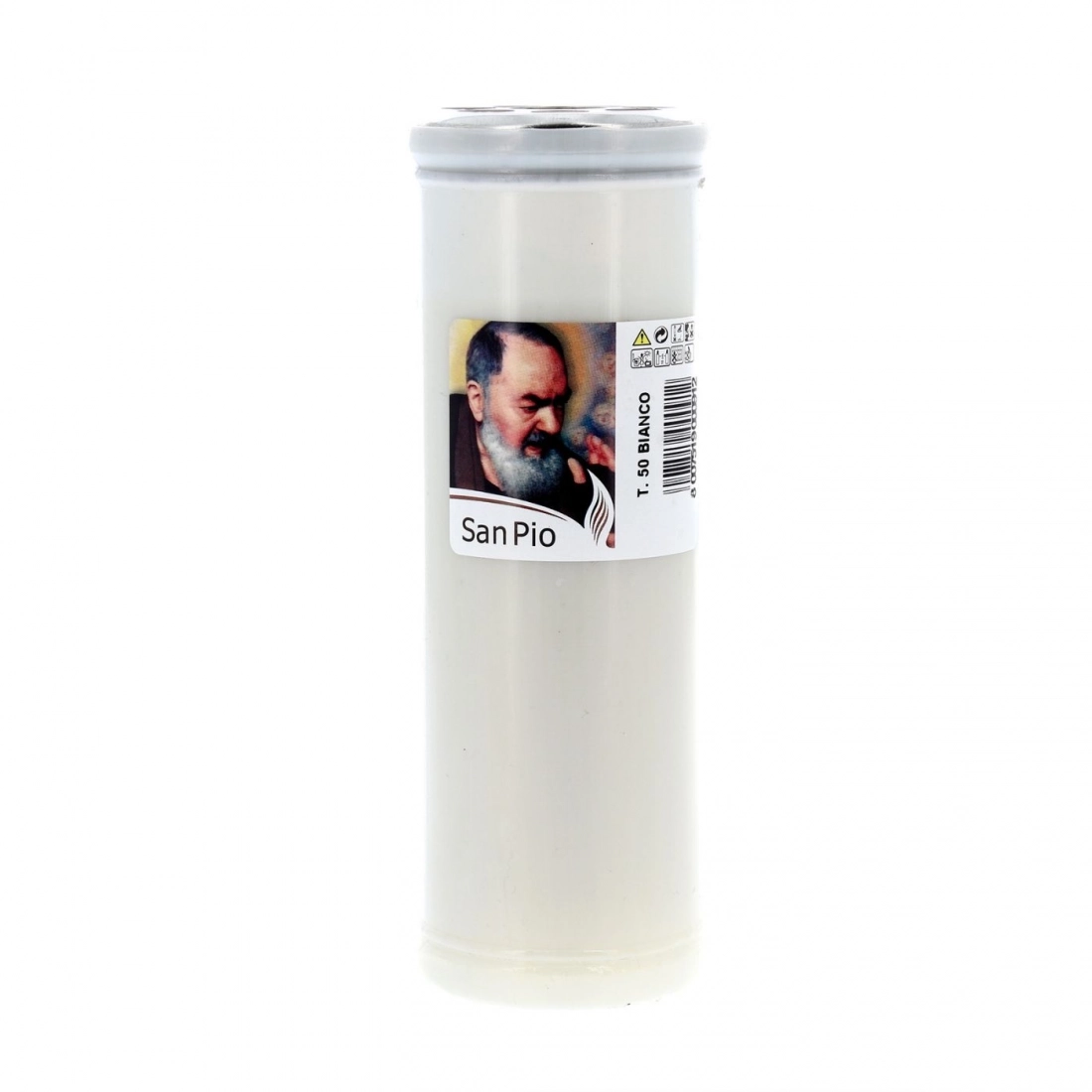 Lumino votivo a cera bianca con portalume in plastica bianca (6,2 cm di diametro e 14,5 cm di altezza). Il lumino è realizzato a mano in Italia da artigiani esperti. La cera ridotta in polvere viene compattata a pressione. La durata è di circa 80 ore.