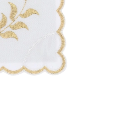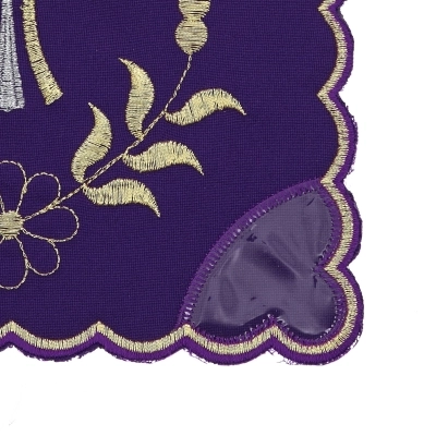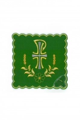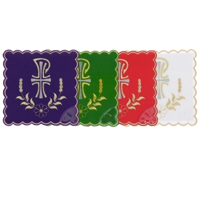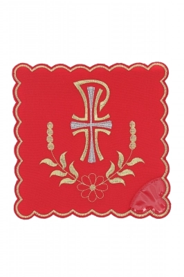 Raffinata palla copricalice bianca, decorata con il ricamo del simbolo Pax e spighe, con bordo dorato. Realizzata in tessuto 100% poliestere, è disponibile nei quattro colori liturgici. All'interno è posizionato un cartoncino bianco che dà rigidità alla palla; grazie ad una comoda tasca è possibile estrarre il cartoncino per consentirne il lavaggio. Un angolo della palla è rivestito in plastica per facilitarne la presa e per evitarene l'usura.