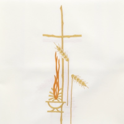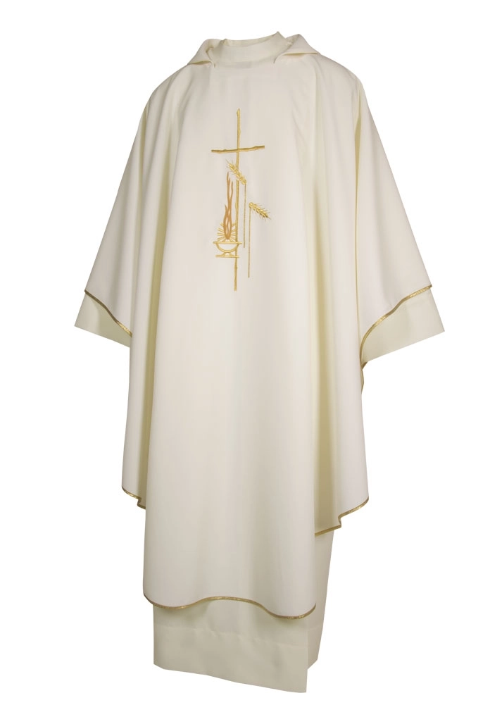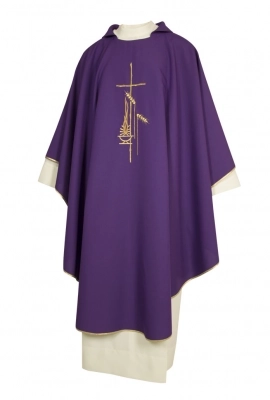 Casula 100% poliestere, decorata con ricamo diretto sia sul davanti che sul retro che raffigura la croce con le spighe e la lampada della preghiera. La casula è completa di relativa stola. Disponibile nei 4 colori liturgici e nella versione rosa. Prodotto interamente in Italia, da un'azienda di artigiani esperti che da molti anni opera nel settore dei paramenti sacri, creando prodotti artigianali e di altissima qualità.