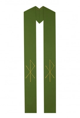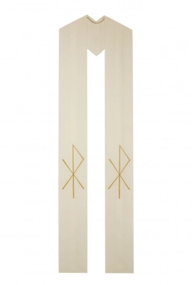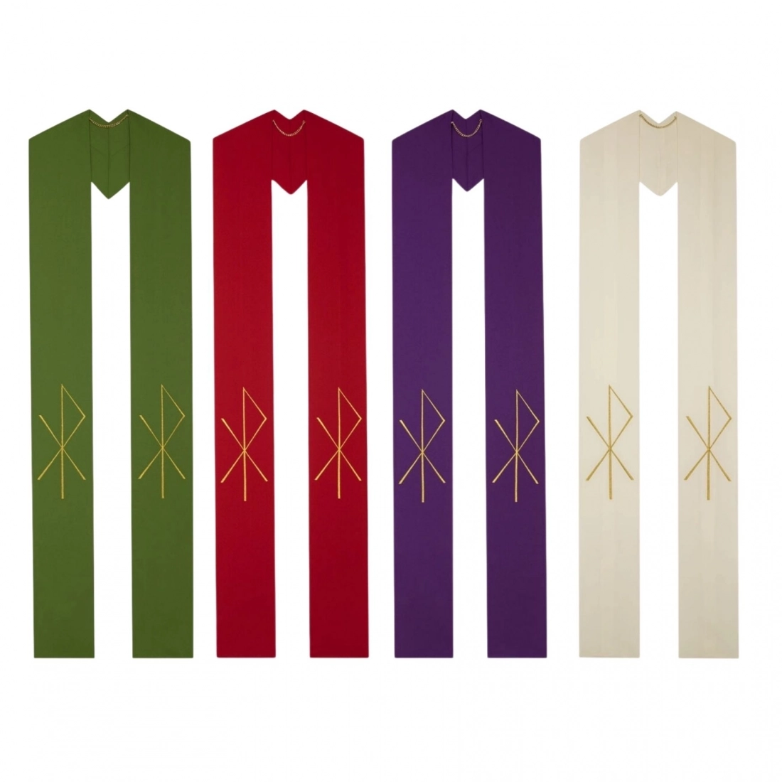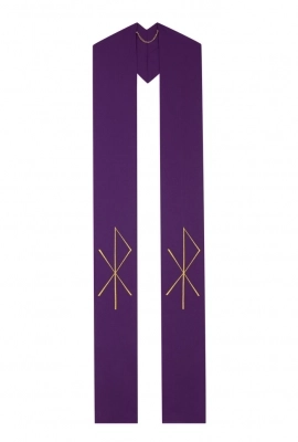 Stola sacerdotale con catenella realizzato in tessuto 100% poliestere, finitura monocolore e ricamo diretto dorato del simbolo Pax. Disponibile nei 4 colori liturgici. La lunghezza complessiva della stola è di 280 cm, quando indossata arriva ben oltre il ginocchio. Realizzata in Italia da un'azienda specializzata nella confezione di paramenti sacri.
