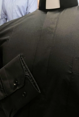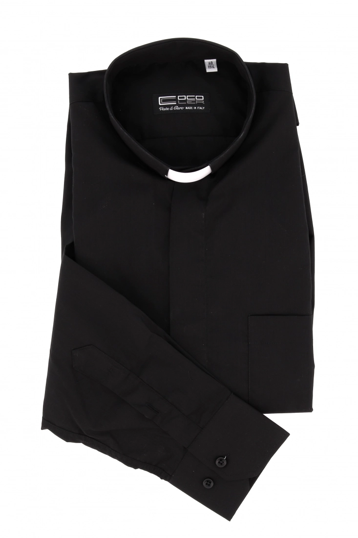 Camicia nera con collo clergy, realizzata in 100% cotone, che garantisce estrema comodità, per la sua morbidezza e traspirabilità ed essendo delicato sulla pelle non provoca irritazioni. Ha una vestibilità ottima e il tessuto garantisce comodità e freschezza. Ha un comodo taschino posto nella parte sinistra, doppio bottone sul polsino e i bottoni posti sul davanti sono coperti dal tessuto della camicia stessa. Realizzata interamente in Italia con materiali di primissima qualità e provenienti dall'Italia o paesi dell'Unione Europea, da un'azienda che cura ogni minimo dettaglio con passione e attenzione.