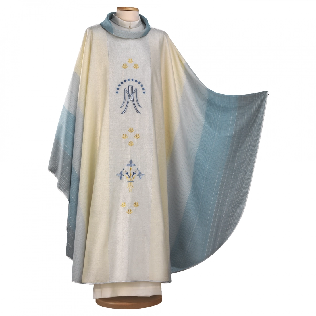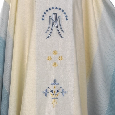 Bellissima casula Mariana in pregiato tessuto di lana lurex con ricamo a macchina direttamente sul mantello. Il prodotto è realizzato interamente in Italia da un'azienda i cui valori sono quelli dell'attenzione meticolosa nella scelta dei tessuti e della passione artigianale con cui lavorano, seguendo criteri di assoluta eccellenza.