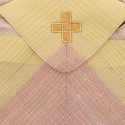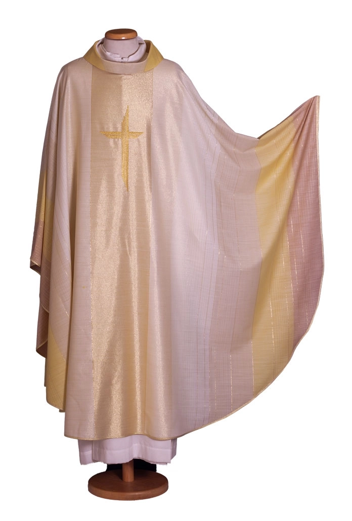 Casula sacerdotale con Croce ricamata in oro a macchina direttamente sul tessuto e posta al centro della casula. Prezioso tessuto sfumato oro composto da 85%lana e 15%lurex, questa componente di lurex lo rende leggero e comodo da indossare. Il prodotto è realizzato interamente in Italia da un'azienda i cui valori sono quelli dell'attenzione meticolosa nella scelta dei tessuti e della passione artigianale con cui lavorano, seguendo criteri di assoluta eccellenza.