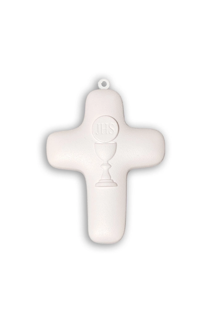 Bellissima croce bianca, effetto pietra, delle dimensioni di 7x10 cm. Dotata di un cordino bianco, può essere comodamente indossata sulla tunica. Sul fronte presenta in rilievo il simbolo dell'Eucaristia: un calice con un'ostia sulla quale è inciso JHS. Ideale da indossare sulle tuniche della Prima Comunione o come idea omaggio per una bomboniera.