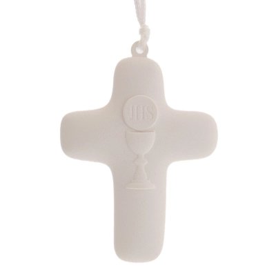 Bellissima croce bianca, effetto pietra, delle dimensioni di 7x10 cm. Dotata di un cordino bianco, può essere comodamente indossata sulla tunica. Sul fronte presenta in rilievo il simbolo dell'Eucaristia: un calice con un'ostia sulla quale è inciso JHS. Ideale da indossare sulle tuniche della Prima Comunione o come idea omaggio per una bomboniera.