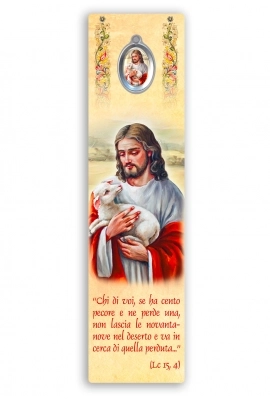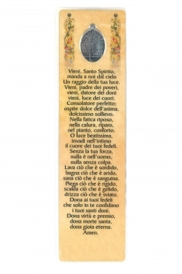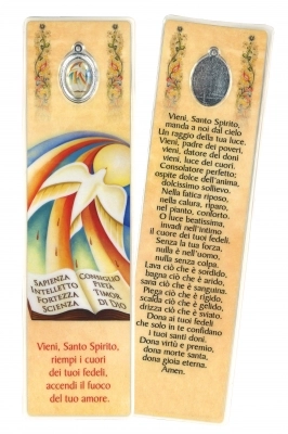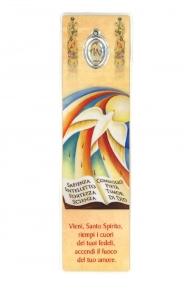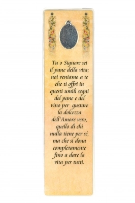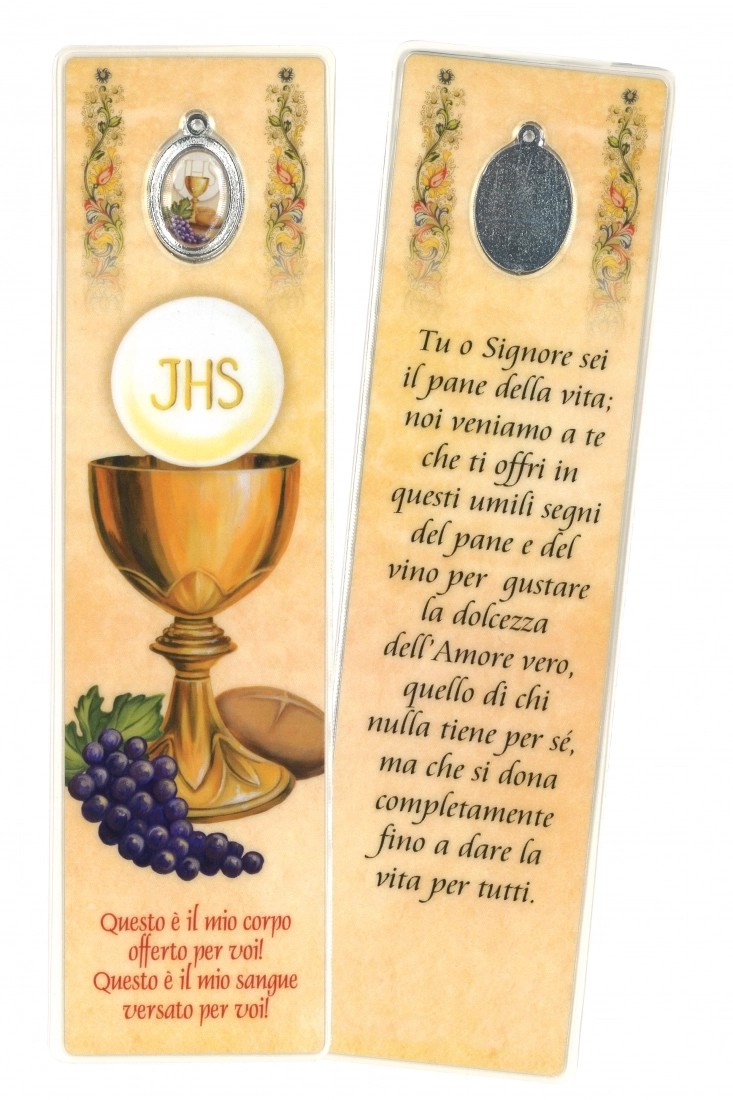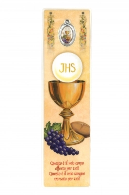 Segnalibro plastificato con medaglia in polimero. È illustrato con simboli che rimandano alla Comunione, alla Cresima e alla Confessione. Un'ottima idea sia come ricordo per chi riceve il sacramento sia come bomboniera.