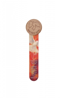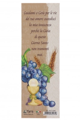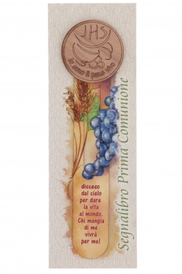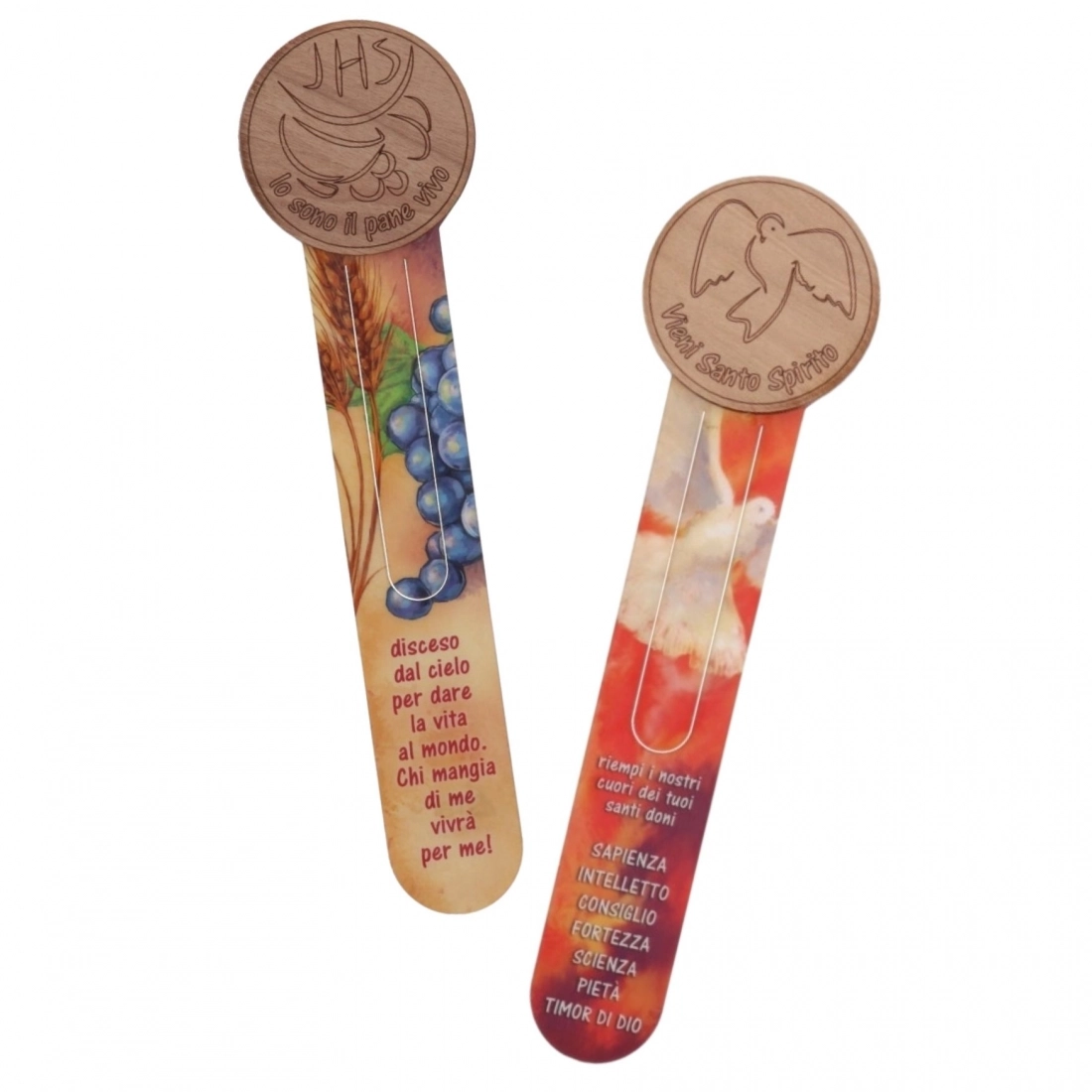 Bel segnalibro, plastificato, con applicazione in legno che rimanda alla Prima Comunione o alla Cresima (in base alla variante scelta). Il segnalibro per la Prima Comunione presenta un’applicazione in legno con la scritta “Io sono il Pane vivo”; quello per la Cresima presenta una colomba e la scritta “Vieni, Spirito Santo”. L'articolo è pensato come ricordino da donare ai ragazzi nel giorno in cui ricevono il sacramento della Prima Comunione o della Cresima. La confezione è corredata di un cartoncino con l'interno bianco per poter scrivere una dedica.