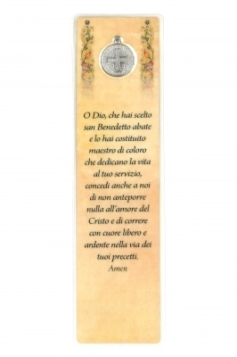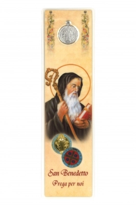 Segnalibro plastificato con medaglia di san Benedetto (dell'altezza di 18 cm). Su un lato è raffigurato san Benedetto, sull'altro c'è una preghiera a lui dedicata. Ottimo prodotto realizzato in Italia.