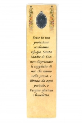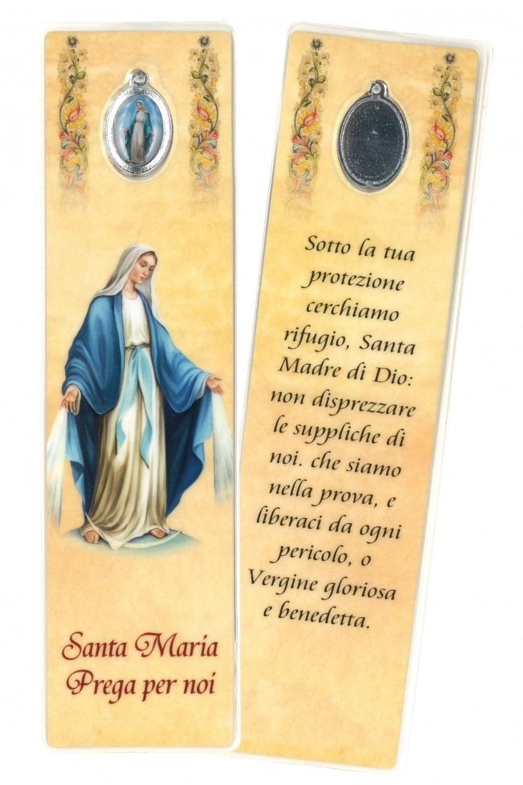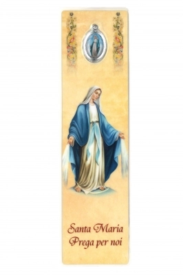 Segnalibro plastificato con medaglia smaltata della Madonna Immacolata (dell'altezza di 18 cm). Su un lato è raffigurata la Vergine Immacolata, sull'altro c'è una preghiera a lei dedicata. Ottimo prodotto realizzato in Italia.