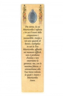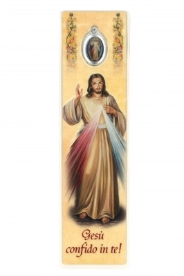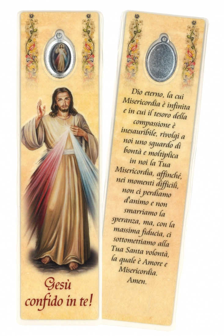 Segnalibro plastificato con medaglia di Gesù Confido in Te (dell'altezza di 18 cm). Su un lato è raffigurato Gesù Misericordioso, sull'altro c'è una preghiera a lui dedicata. Ottimo prodotto realizzato in Italia.