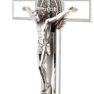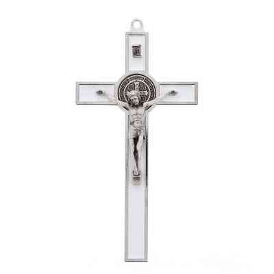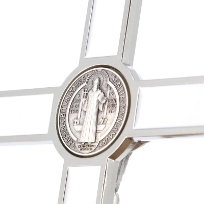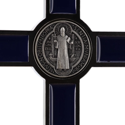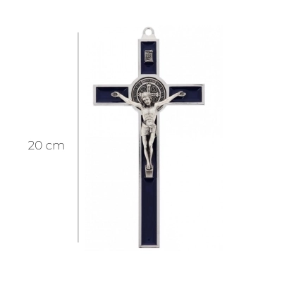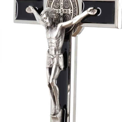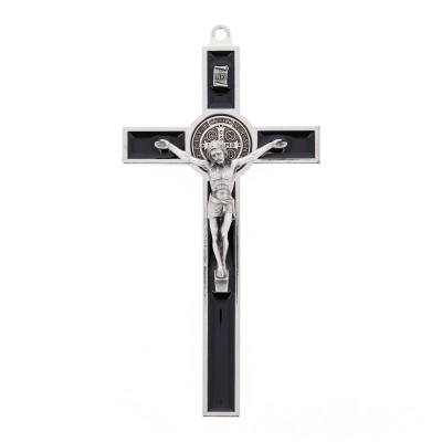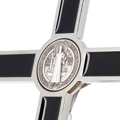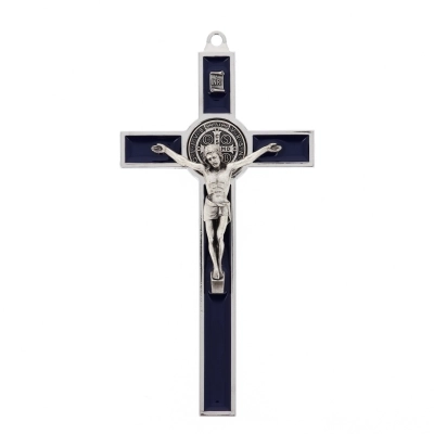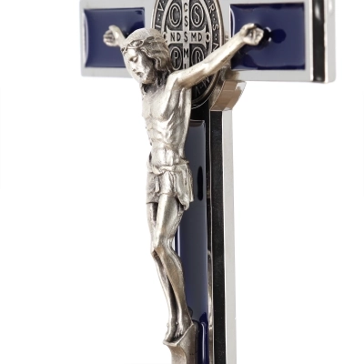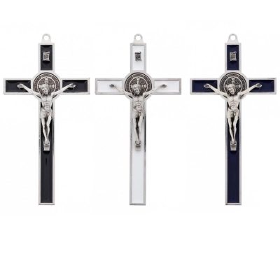 Bel crocifisso in metallo da appendere. L'interno del crocifisso è smaltato lucido e al centro della croce è posizionata la medaglia di San Benedetto. Il corpo di Cristo è in metallo. Il prodotto, realizzato in Italia, è disponibile nei colori bianco, nero e blu. Realizzato in Italia.