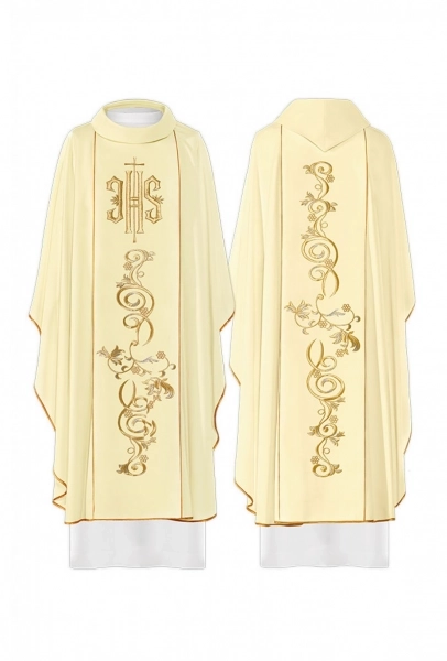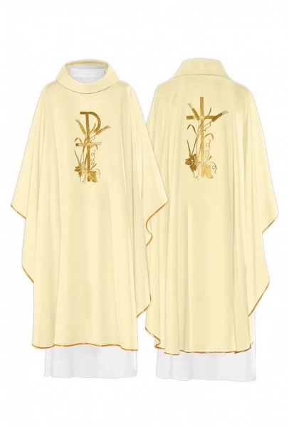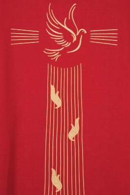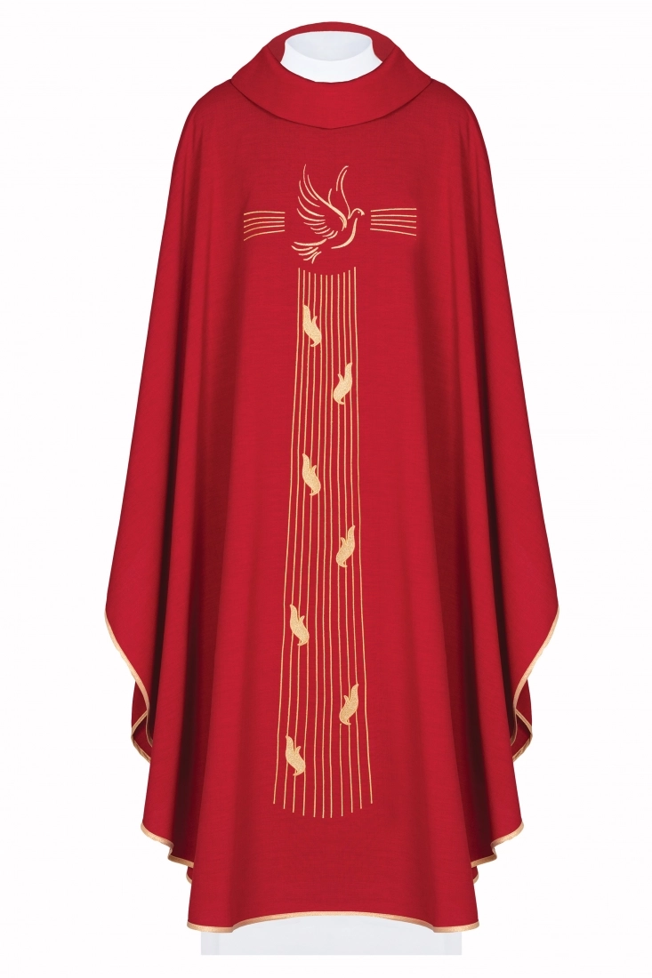 Bellissima casula di colore rosso realizzata in poliestere (80%) e cotone (20%), con tessuti di alta qualità. La casula presenta il ricamo dorato di una colomba, simbolo dello Spirito Santo. Confortevole e comoda da indossare. Disponibile nel solo colore rosso, e si indossa in occasione di esequie, festività dei martiri, venerdì Santo, la domenica delle Palme, la Pentecoste. Il rosso simboleggia lo Spirito Santo e il sangue di Cristo. Realizzata in Polonia da un'azienda specializzata nella confezione di paramenti sacri.