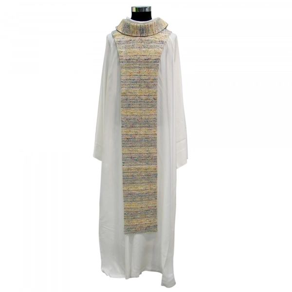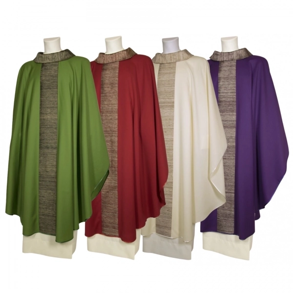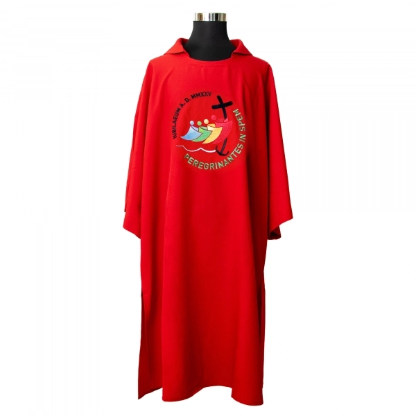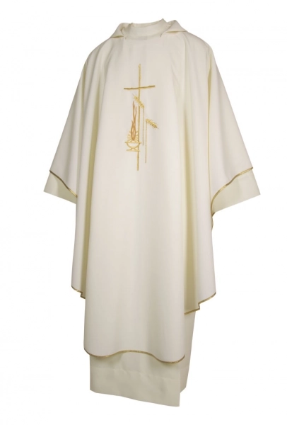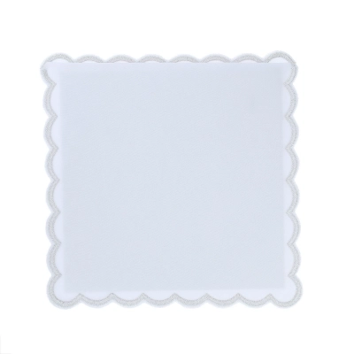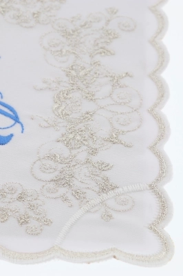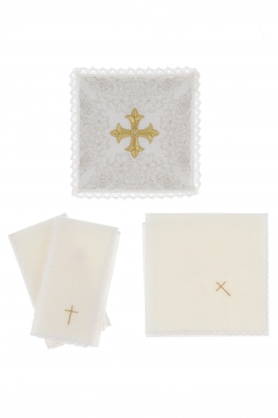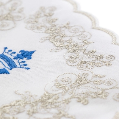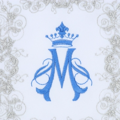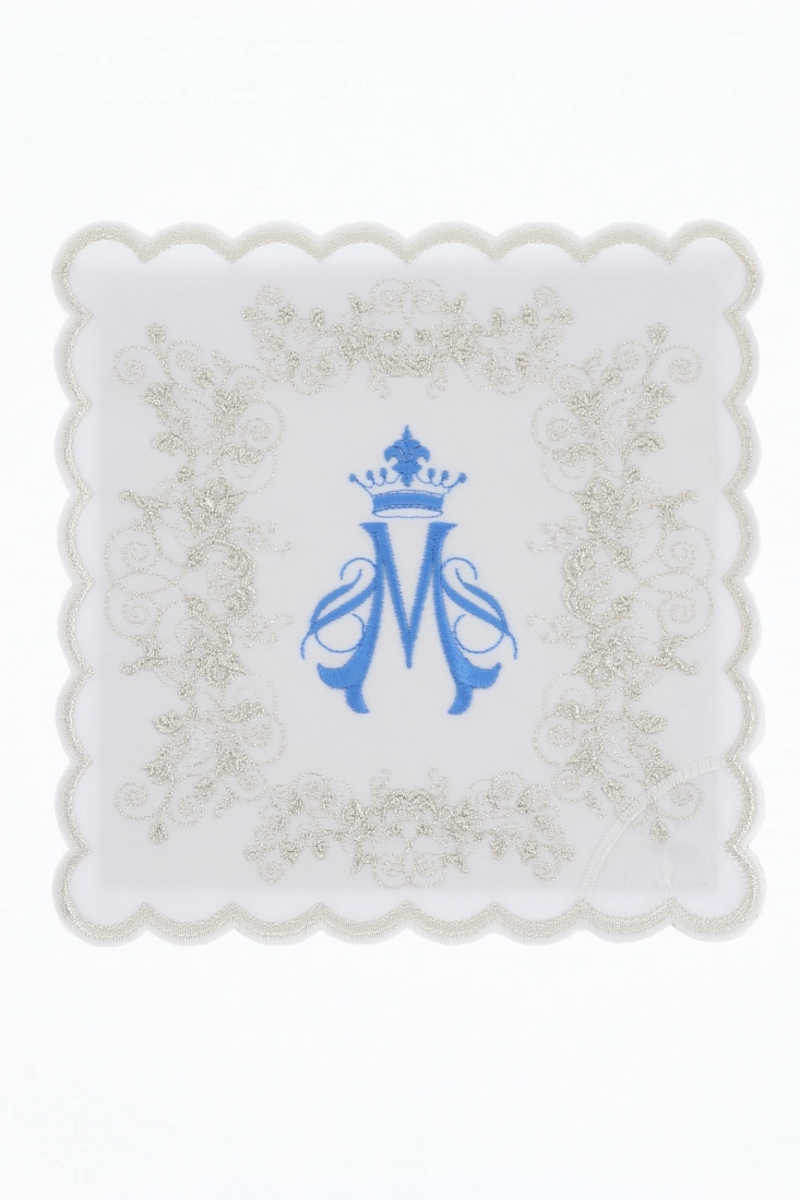 Raffinata palla copricalice in poliestere, decorata con il ricamo di un motivo mariano di colore azzurro. All'interno è posizionato un cartoncino bianco che dà rigidità alla palla; grazie ad una comoda tasca è possibile estrarre il cartoncino per consentirne il lavaggio. Un angolo della palla è rivestito in plastica per facilitarne la presa e per evitarene l'usura.