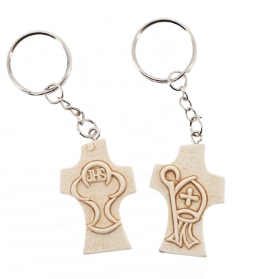 Raffinato portachiavi in resina bianca con i simboli della Comunione o della Cresima (in base al modello scelto). È dotato di anello in acciaio per inserire le chiavi. Un'idea originale, che unisce significato e utilità, per ricordare giorni speciali!