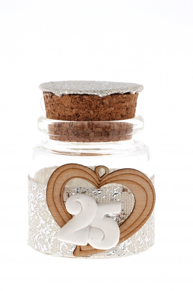Delizioso vasetto portaconfetti in vetro (dell'altezza di 5 cm), con tappo in sughero, cuore in legno e numero in porcellana. Ideale come segnaposto e bomboniera per festeggiare un importante traguardo della vita matrimoniale: il 25° anniversario di nozze!