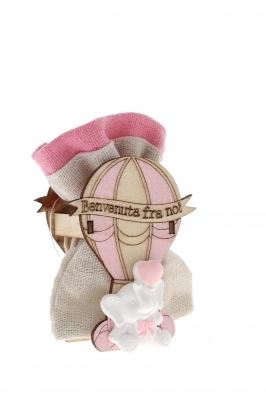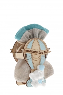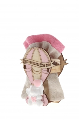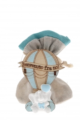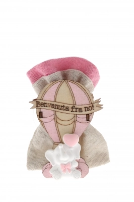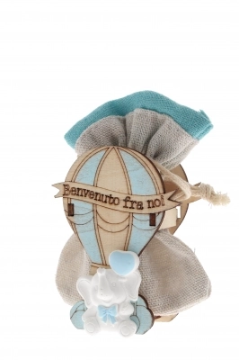 Delizioso portaconfetti per bimbo e bimba, con dettagli rosa o azzurri in base al modello scelto. Il sacchetto è inserito all'interno di una mongolfiera in legno su cui è incisa la frase "Benvenuto fra noi". Alla base della mongolfiera un tenero elefantino tiene un palloncino. Ideale come ricordino per festeggiare la nascita o il Battesimo.