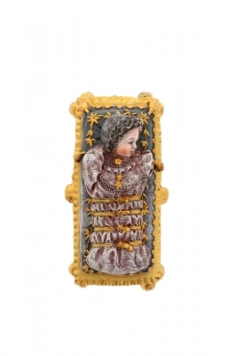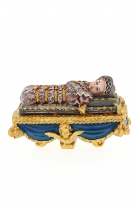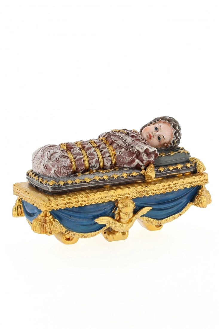 Originale statua di Maria Bambina, realizzata in resina colorata (della lunghezza di 10 cm). Maria è rappresentata adagiata su un lettino e avvolta da una copertina ricamata. Ricca di dettagli, la statua è confezionata in una elegante scatola di cartone bianco.