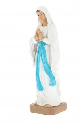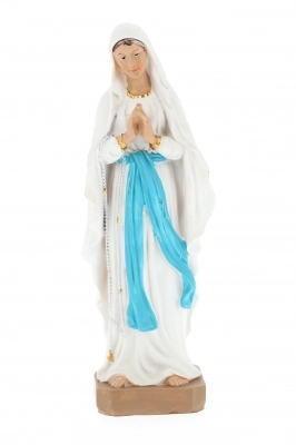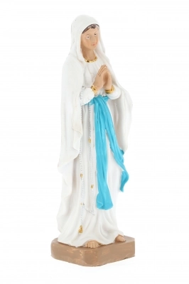Statua della Madonna di Lourdes in resina colorata, dell'altezza di 15 cm. La Vergine è rappresentata nella classica posizione di preghiera: con le mani giunte e lo sguardo amorevole rivolto verso il basso.