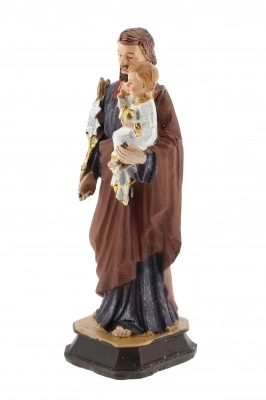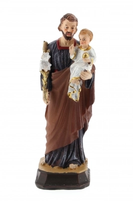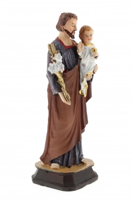 Statua di san Giuseppe in resina colorata, dell'altezza di 15 cm. Il Santo tiene in braccio Gesù Bambino e impugna, con l'altra mano, il classico bastone con i gigli, fiori a lui associati perché sono simbolo di purezza.