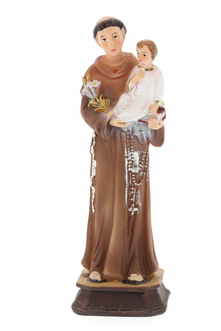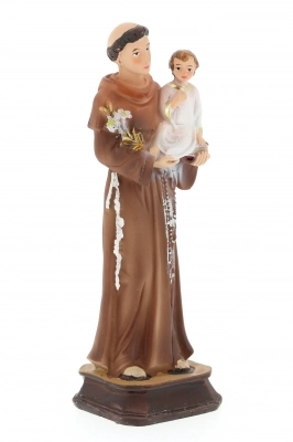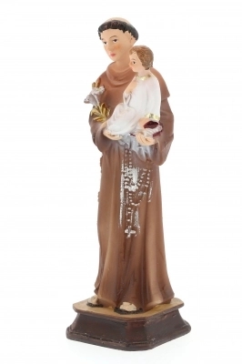 Statua di sant'Antonio da Padova, in resina colorata dell'altezza di 15 cm. Il Santo, Dottore della Chiesa, martello degli eretici, protettore dei poveri, è inoltre protrettore dei matrimoni.