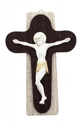 Elegante e originale crocifisso in legno dallo stile moderno (23x34 cm). Costituito da un doppio livello con colore a contrasto e Cristo in resina bianca. La particolarità di questo crocifisso è la preghiera del "Padre Nostro" impressa sulla croce.