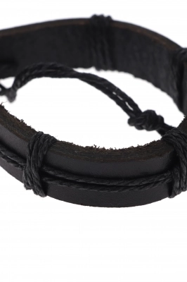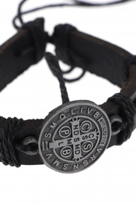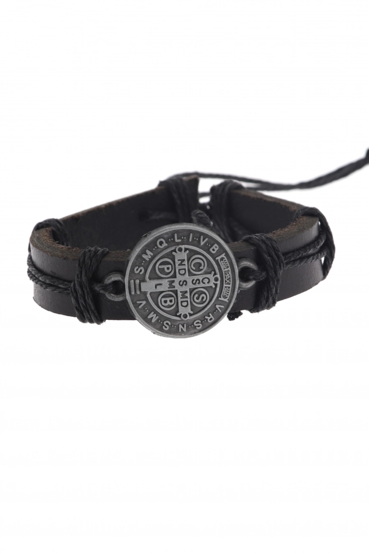 Bracciale sportivo, con cinturino regolabile in cuoio nero e chiusura regolabile. Al centro c'è la medaglia di San Benedetto. Unisex