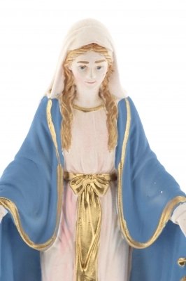Bellissima statua della Madonna Immacolata (dell'altezza di 15 cm) realizzata interamente in resina colorata, dotata di Medaglia Miracolosa argentata e base. Ideale per essere esposta in qualsiasi ambiente domestico.