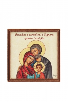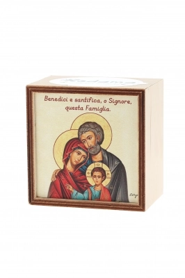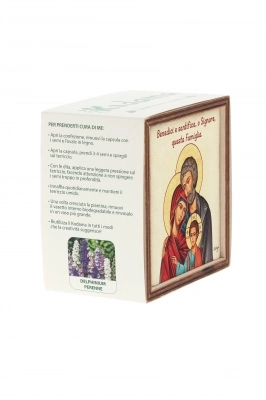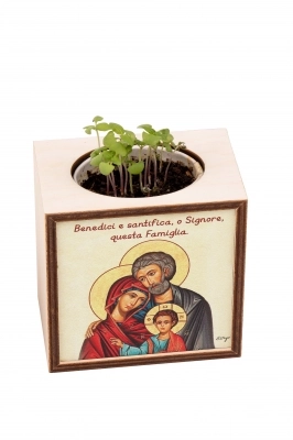 Piantina Kodama in cubo di legno - immagine icona Sacra Famiglia. Dimensioni 10x10 cm