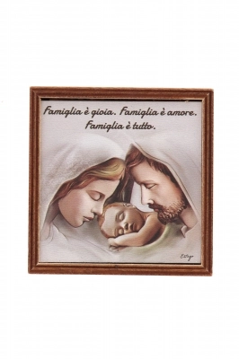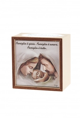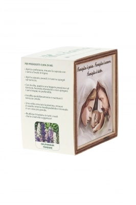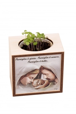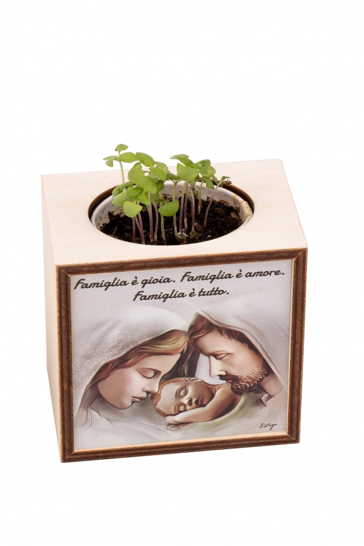 Piantina Kodama in cubo di legno - immagine Sacra Famiglia. Dimensioni 10x10 cm