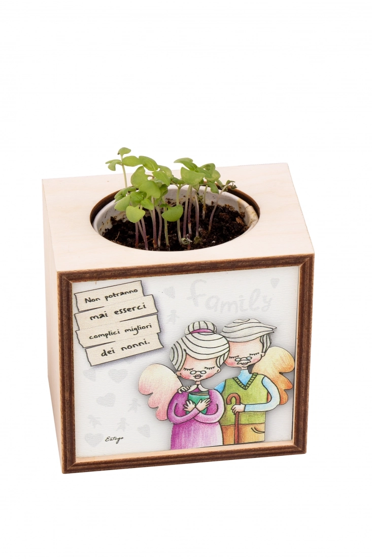 Piantina Kodama in cubo di legno - immagine Nonni. Dimensioni 10x10 cm