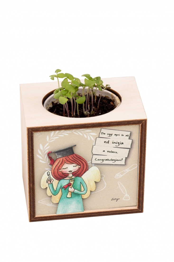 Kodama è un cubo di legno decorato che contiene un vasetto biodegradabile con all’interno del terriccio e dei semi di piante aromatiche e fiori pronti per essere piantati. Perfetto come regalo o come bomboniera, è fatto in legno di betulla che, con le sue leggere venature, dona unicità al prodotto.