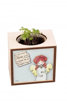 Piantina Kodama in cubo di legno - immagine Nascita. Dimensioni 10x10 cm