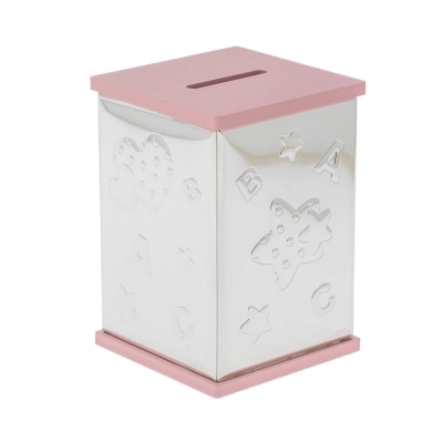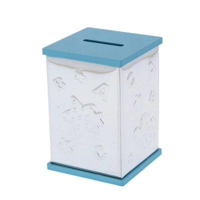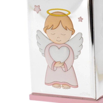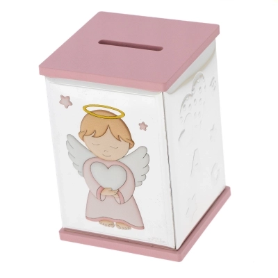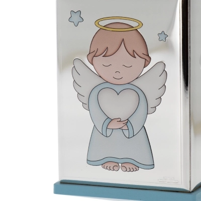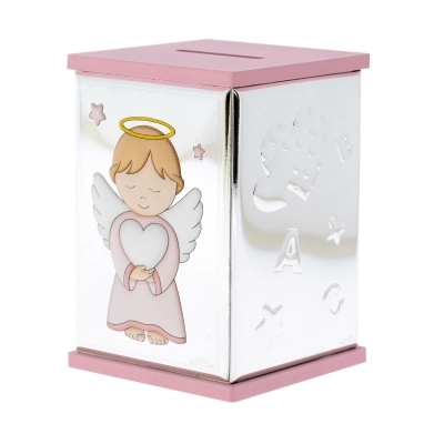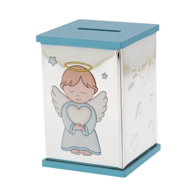 Salvadanaio, azzurro o rosa (misura 8x8 cm e ha un'altezza di 11 cm), con la raffigurazione di un angelo in preghiera in argento Mirò con dettagli colorati. Realizzata in Miro Silver, nuovo metallo che include uno strato di argento puro 999,95%, conferendo al metallo una grande solidità e resistenza all'ossidazione. Ottima idea regalo in occasione di un Battesimo o di una nascita. L'articolo è confezionato nella sua originale scatolina e completo di certificazione del produttore. Realizzato in Italia da un'azienda leader nella produzione di quadri e oggettistica da regalo in argento.